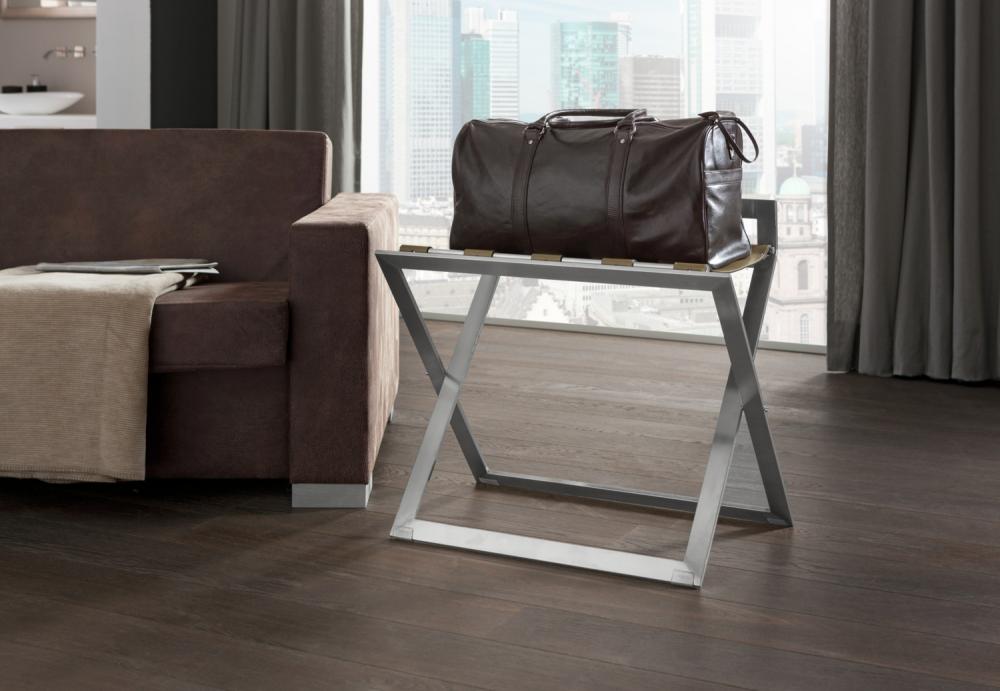 Sklopivi stalak za prtljag je izrađen od nehrđajućeg čelika i zakovanih kaiševa od imitacije kože.