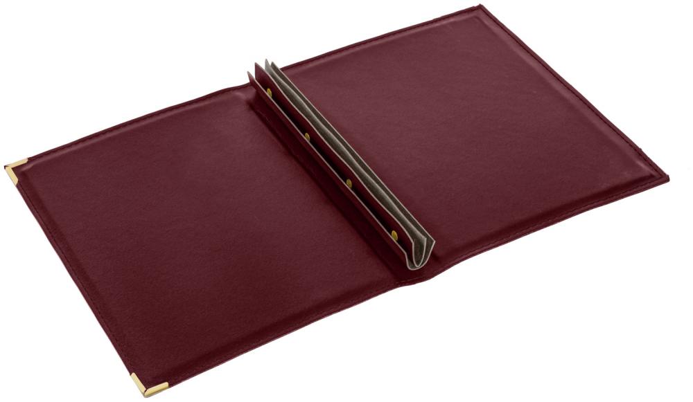 Atraktivni meniji od imitacije kože u neutralnom dizajnu. Fascikle su pažljivo obrađene i apsolutno lako se čiste. Svi modeli sa metalnim uglovima zlatne boje, 4 skrivena zavrtnja za knjige za pričvršćivanje korica veličine DIN A4 ili DIN A5 kao i duboko utisnutim zlatnim štampom. . Providne korice se moraju posebno naručiti.
