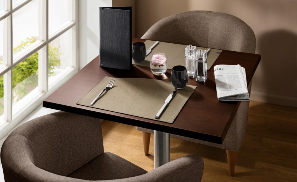 Meni od celofan kartonskog materijala sa izgledom drveta. Dvostruki rukavi, koji se prodaju zasebno, su pričvršćeni unutrašnjom gumenom trakom. Sistem umetanja: gumena traka.