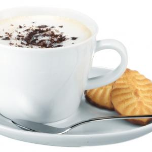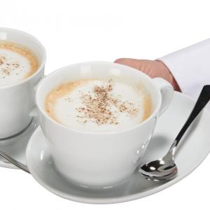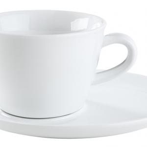 Moderne šolje i tanjiri od bijelog porcelana. Može se prati u mašini za suđe i može se koristiti u mikrotalasnoj pećnici.