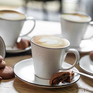 Šolja za kafu iz porcelanske serije Fungio, napravljene og hotelskog porcelana visokog kvaliteta. Bijela sa crnim obodom i malim, nepravilnim tačkama. Može se prati u mašini za suđe i može se koristiti u mikrotalasnoj pećnici.
