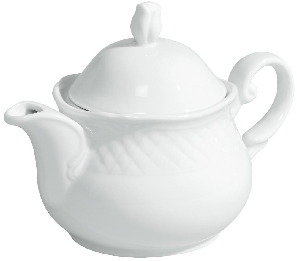 Bijeli porculanski bokal za čaj sa poklopcem. Sa klasičnim elegantnim reljefom. Može se prati u mašini za suđe i može se koristiti u mikrotalasnoj pećnici.