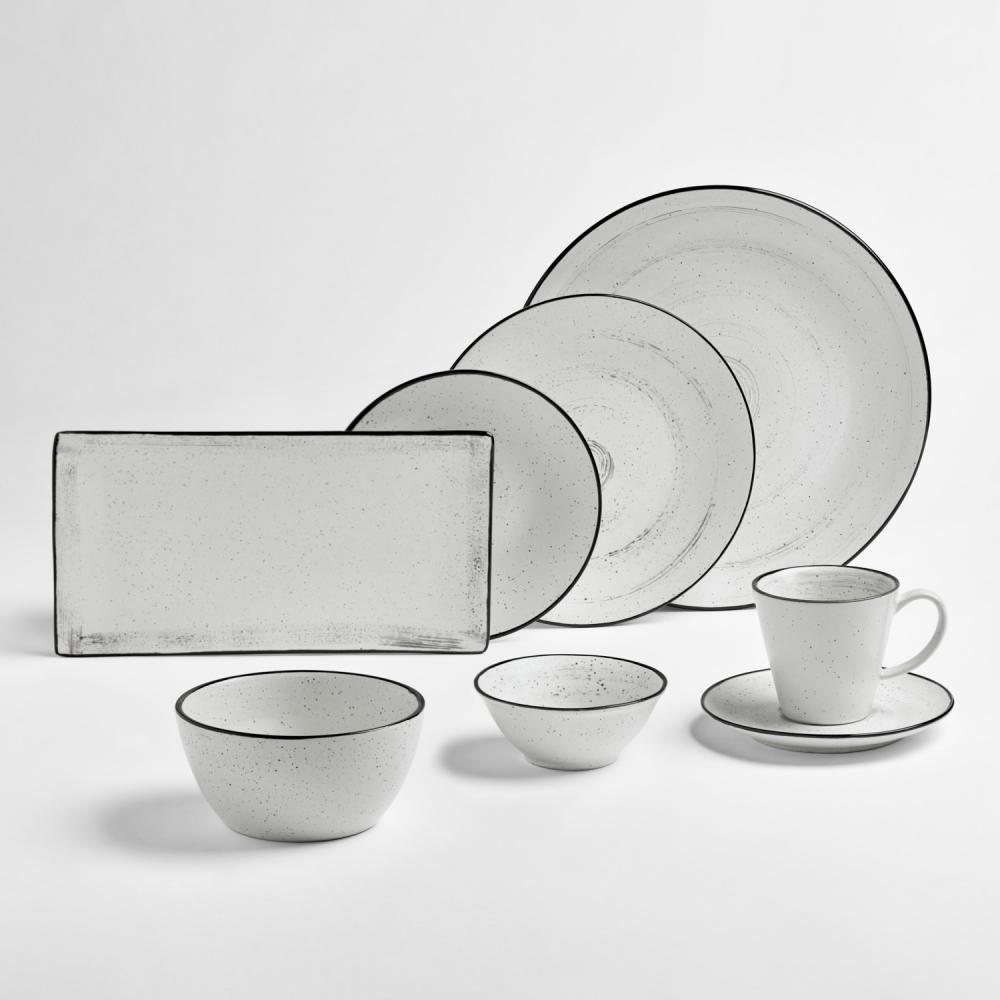 Zdjela iz porcelanske serije Fungio, hotelski porcelan visokog kvaliteta. Bijela sa crnim rubom i malim, nepravilnim tačkama. Može se prati u mašini za suđe i može se koristiti u mikrotalasnoj pećnici.