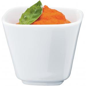 Oblikovane mini posude od bijelog porcelana. Otporno na pećnicu do 300 °C. Može se prati u mašini za suđe i može se koristiti u mikrotalasnoj pećnici.