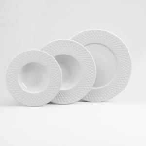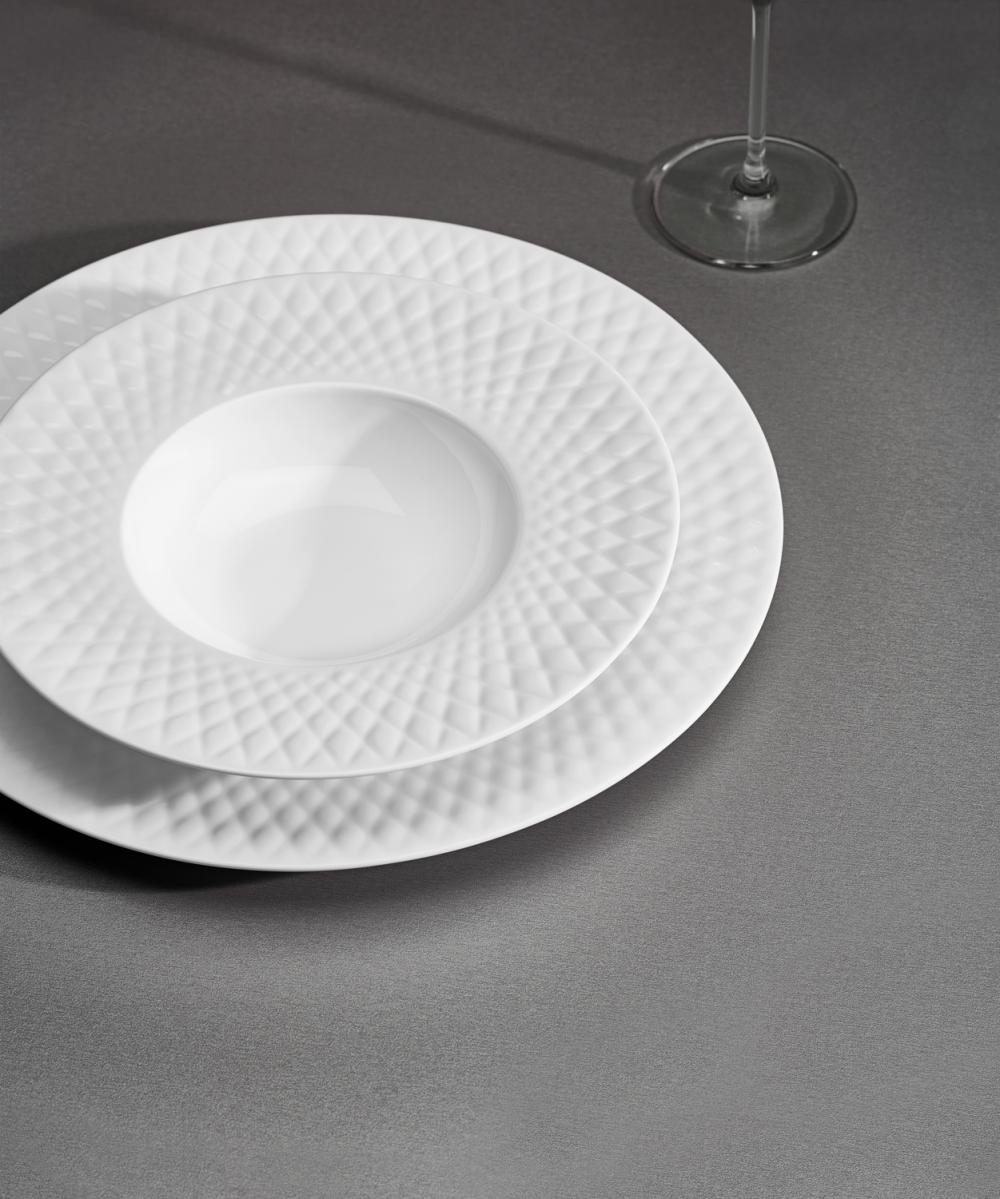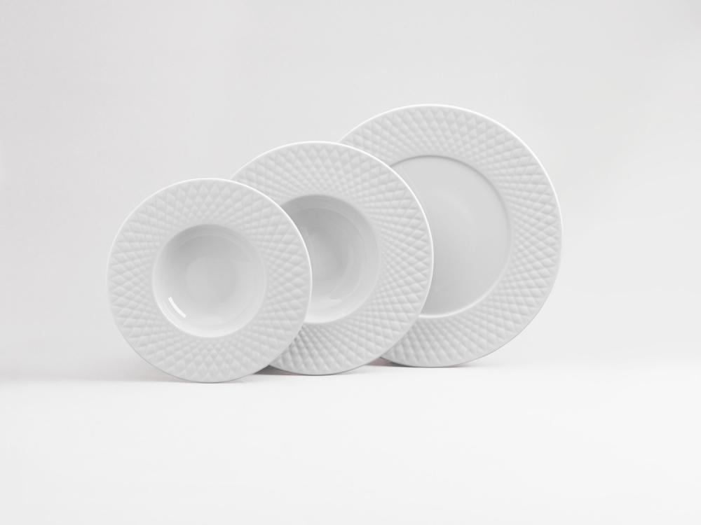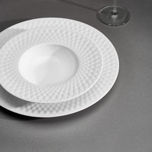 Reljef u obliku dijamanta i široki rub od 5-6 cm čine tanjir tako posebnim. Napravljen je od visokokvalitetnog porcelana. Može se prati u mašini za suđe i može se koristiti u mikrotalasnoj pećnici.