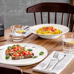 Bijeli porcelanska tanjir za testeninu. u raznim veličinama. Jednostavan, bezvremenski oblik. Može se prati u mašini za suđe i može se koristiti u mikrotalasnoj pećnici.