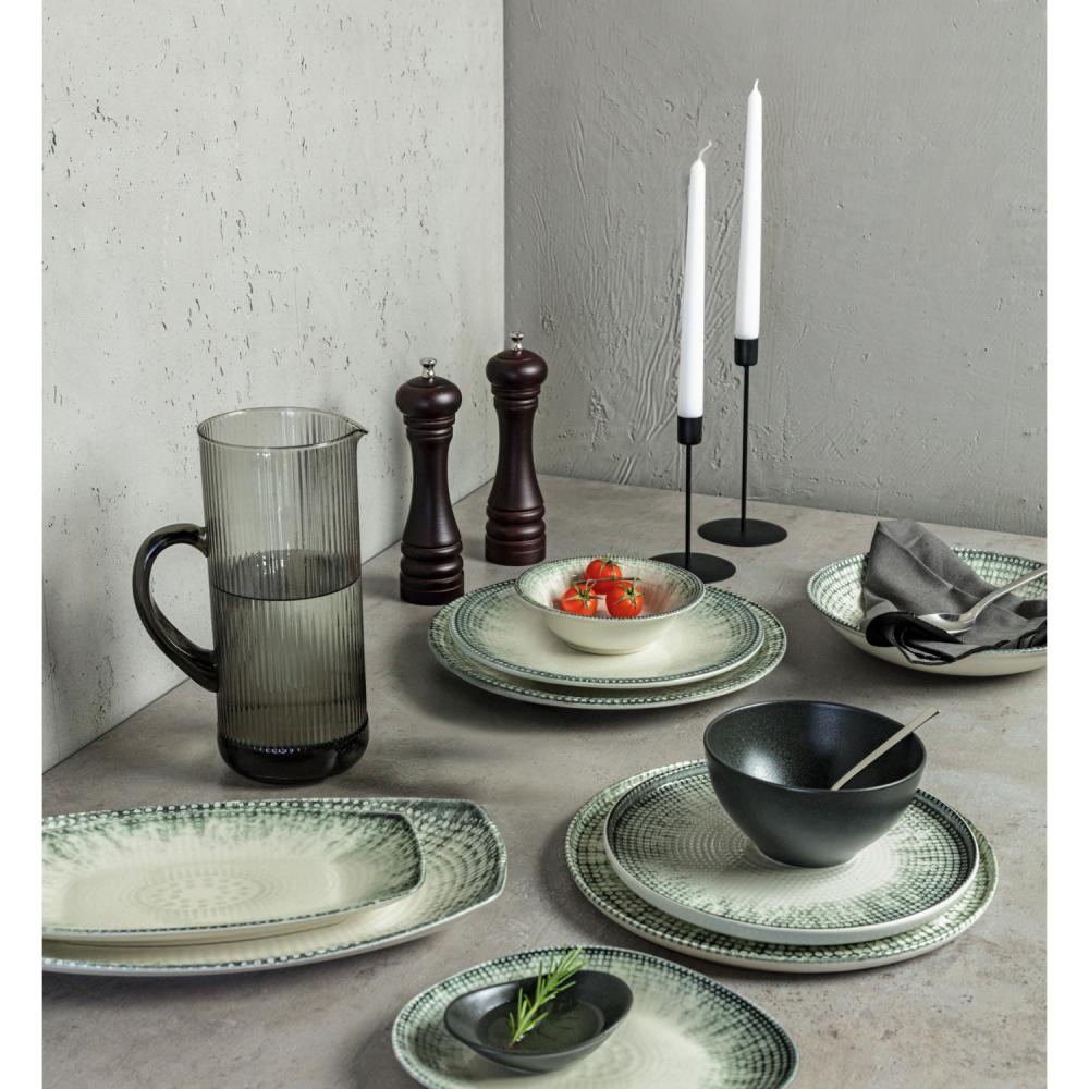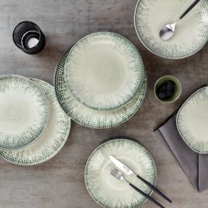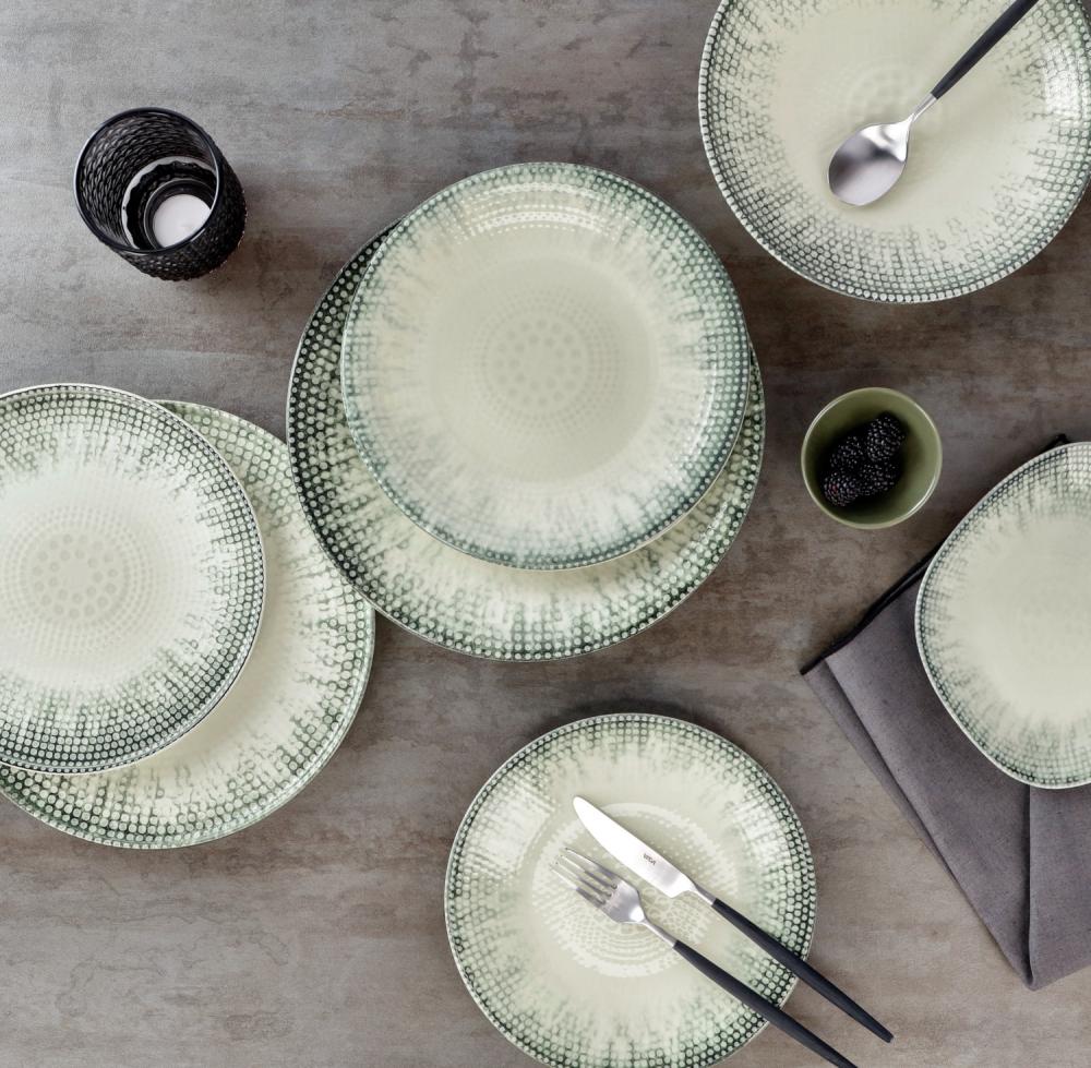 Obojeni porculan serije Kuori, koji se sastoji od činija, tanjira ravnih i tanjira dubokih. Može se koristiti u mikrotalasnoj pećnici i može se prati u mašini za suđe.