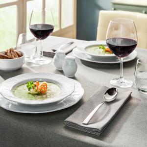 Uz našu atraktivnu hotelsku porcelansku seriju Menuett, vaši kulinarski delikatesi predstavljaju plemenit, lijep osećaj zadovoljstva! A filigranski reljef savršeno naglašava klasično-tradicionalni stil vaše kuće. Može se prati u mašini za suđe i može se koristiti u mikrotalasnoj pećnici!