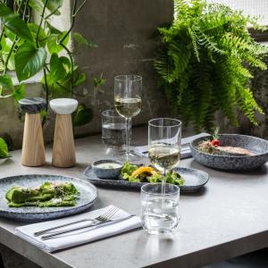Tanjir napravljen od visokokvalitetne kamene keramike. Serija posuđa Mamoro oduševljava svojim izgledom prirodnog, crnog i bijelog kamena i divno se uklapa u rustičan ili starinski ambijent. Sastoji se od ravnih i dubokih tanjira, činija u nekoliko veličina i pravougaonih tanjira, tako da se sve savršeno uklapa. Može se prati u mašini za suđe i može se koristiti u mikrotalasnoj pećnici.