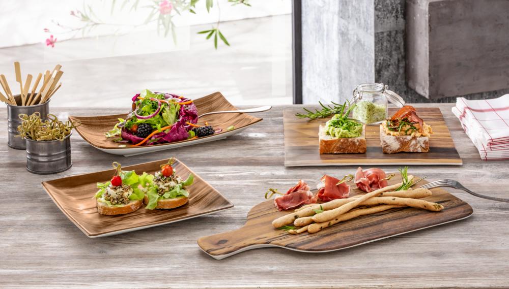 Serija napravljena od melamina u izgledu drveta. Izdržljiv zbog otpornosti na udarce i lomljenje. Opseg primene između -30 °C i +70 °C. Materijal: melamin.