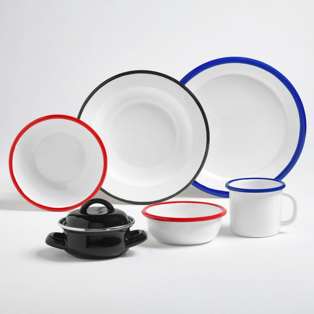 Svaki pojedinačni dio ima karakter ručno rađenog unikata sa svojom tipičnom bordurom u boji i naglašava vaš individualni stil. Materijal: emajl. Može se prati u mašini za suđe (preporučeno: program za čaše ili ručno pranje), izbjegavajte pregrevanje iznad 200° C, nije pogodno za mikrotalasne pećnice.