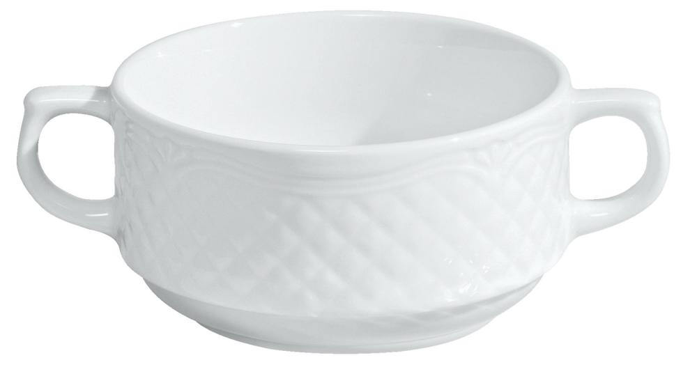 Bijela porcelanska činija za supu. Sa klasičnim elegantnim reljefom. Može se prati u mašini za suđe i može se koristiti u mikrotalasnoj pećnici.