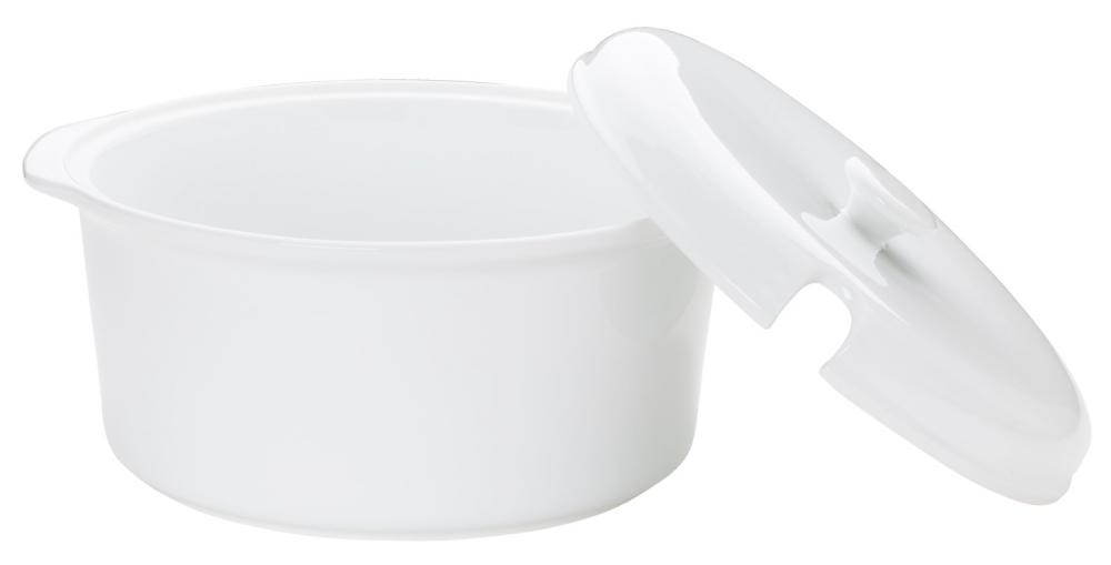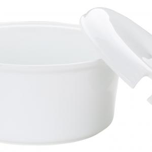 Činija za supu od čistog bijelog hotelskog porcelana sa poklopcem sa udubljenjem za kašiku. Može se prati u mašini za suđe i može se koristiti u mikrotalasnoj pećnici.