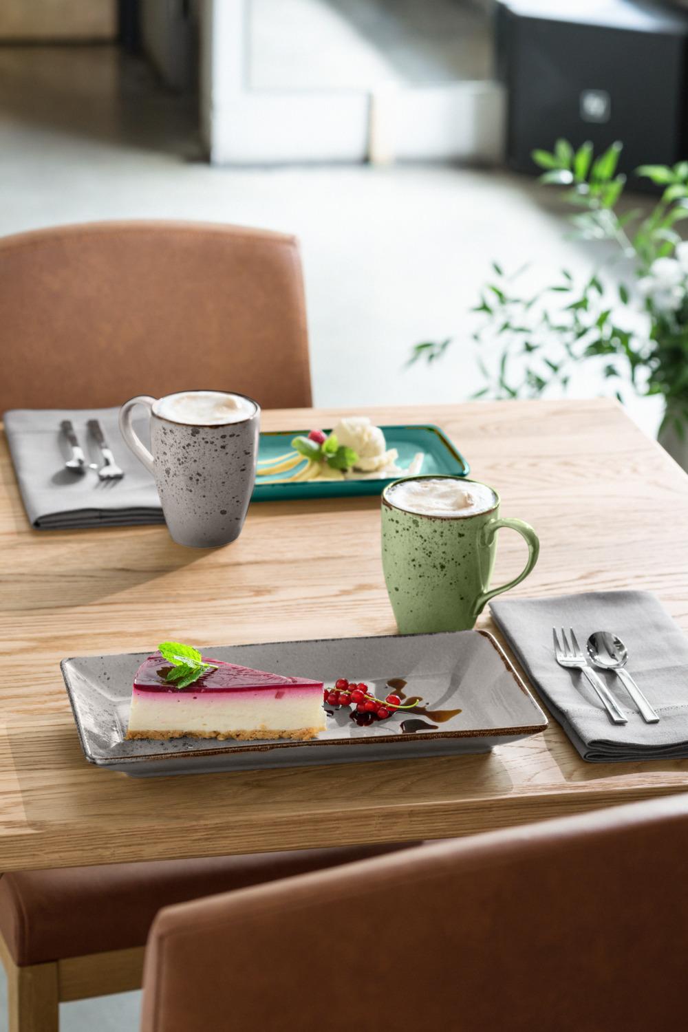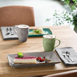 Set se sastoji od četiri šoljice za kafu 0,24 l, tanjira za šolju za kafu Ø 16,5 cm, espresso šoljica 0,12 l, tanjira za espreso šoljice Ø 12,4 cm i šoljica od 0,3 l svaka. Posuđe izgleda ručno sa svojim nepravilnim ivicama. Boja: siva. Može se prati u mašini za suđe i može se koristiti u mikrotalasnoj pećnici.