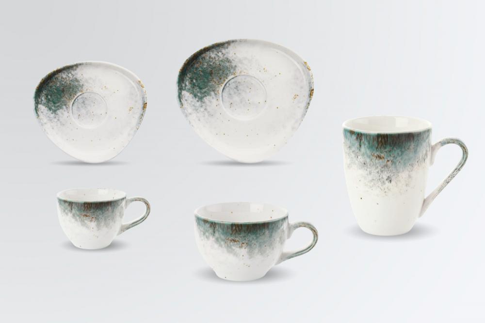 Set se sastoji od četiri šoljice za kafu 0,2 l, tanjira za šolju za kafu 15,5k14 cm, espresso šoljica 0,1 l, tanjira za espresso šolje 12,5k11 cm i šoljica po 0,3 l. Posuđe nepravilnih, organskih oblika.