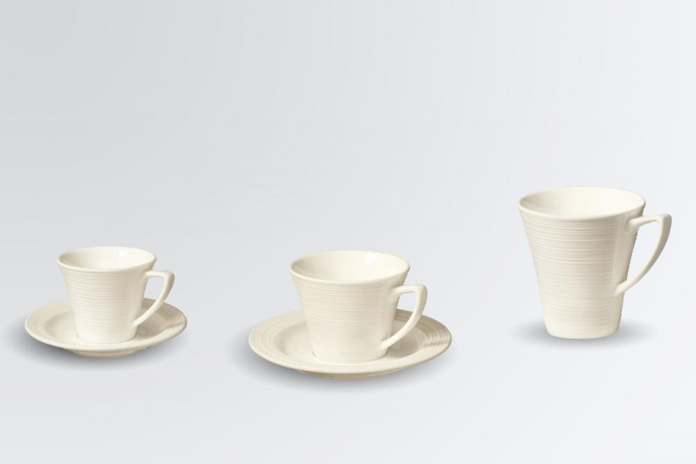 Set se sastoji od četiri šoljice za kafu 0,2 l i tanjira za šolju za kafu Ø 15 cm, espreso šoljica 0,1 l i tanjira za espreso šoljice Ø 12 cm i šoljica od 0,3 l svaka.