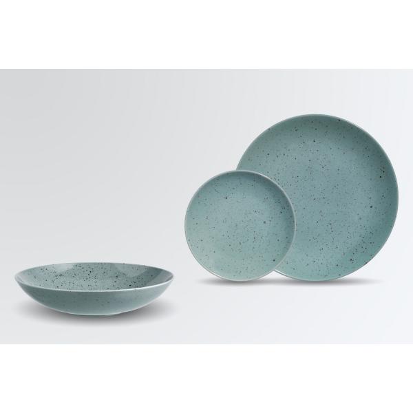 Set se sastoji od četiri ravna tanjira Ø 16 i 24 cm i tanjira dubokih Ø 23 cm svaki. Nepravilne mrlje daju posuđu vintage karakter. Boja: tirkizna. Materijal: porcelan. Može se prati u mašini za suđe i može se koristiti u mikrotalasnoj pećnici.