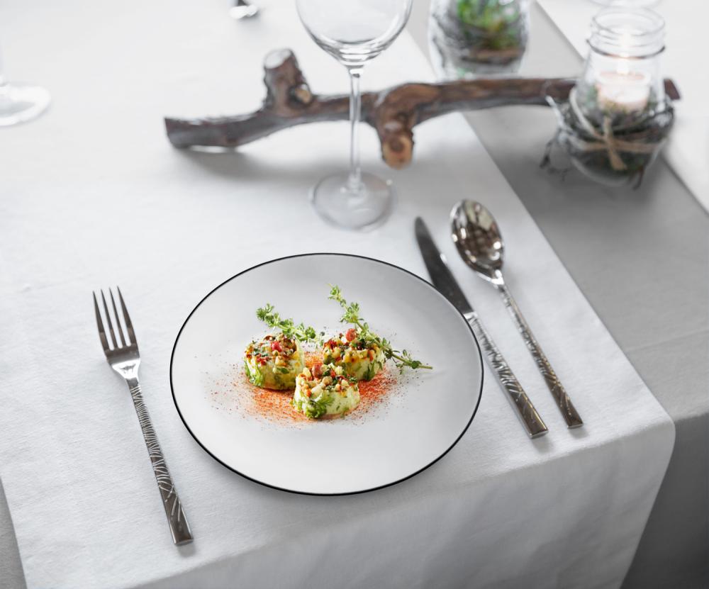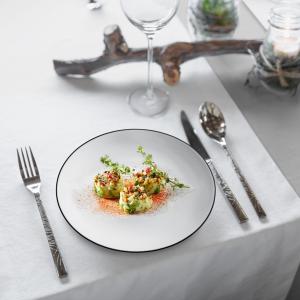 Set se sastoji od četiri šoljice za kafu 0,22 l, tanjira za šolju za kafu Ø 15 cm, tanjira ravnih Ø 21 cm i 27 cm i tanjira dubokih Ø 20 cm svaki. Bijelo posuđe sa ukrasnim crnim rubom.