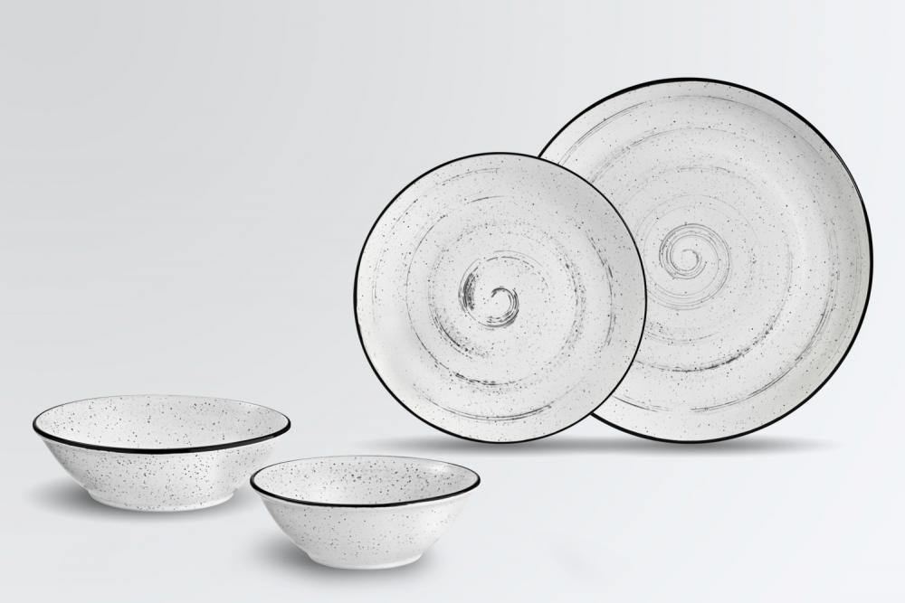 Set se sastoji od četiri ravna tanjira Ø 21,5 cm i 27 cm i činije ØkH 14k4,7 (0,32 l) i 16,5k4,8 cm (0,48 l) svaka.