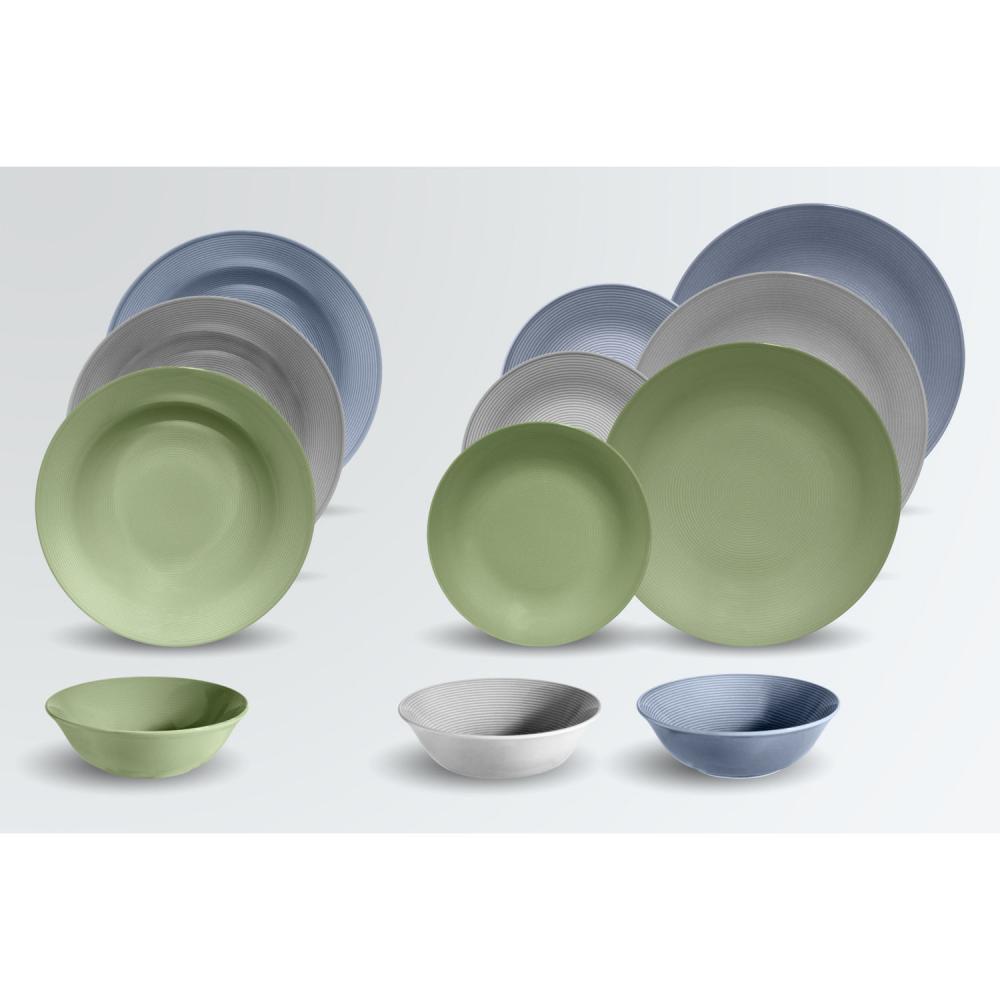Set se sastoji od šest ravnih tanjira Ø 18,5 cm i 25 cm, tanjira dubokih Ø 23 cm i činija ØkH 14k4,5 cm (0,32 l). Svaka boja i veličina su 2 tanjira ili činije u setu.