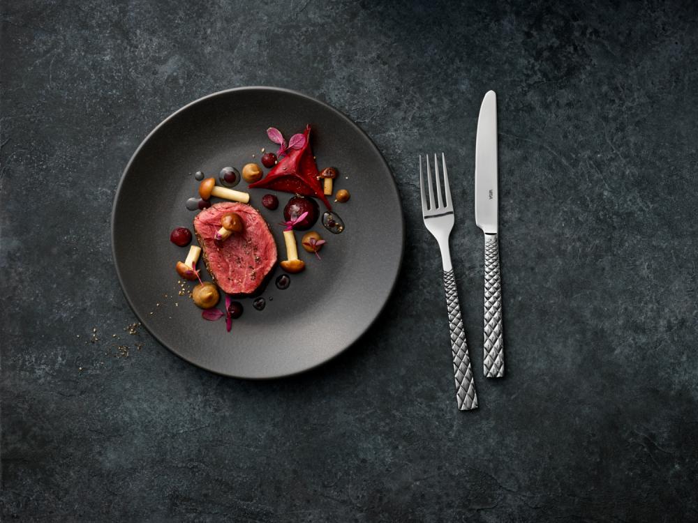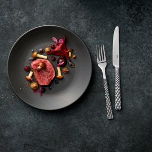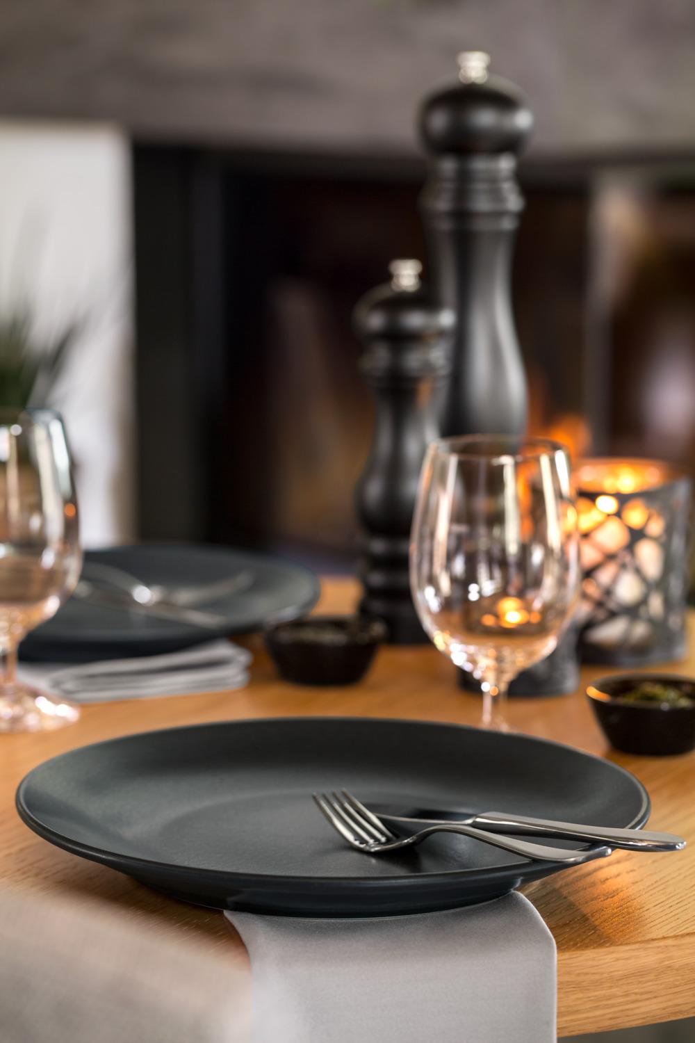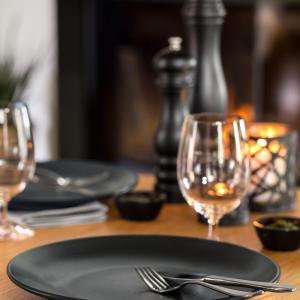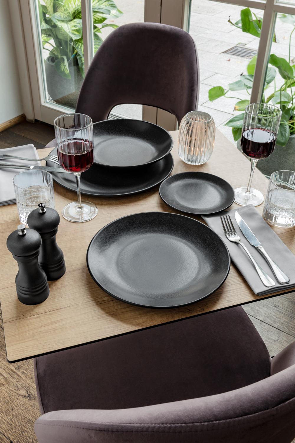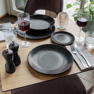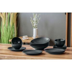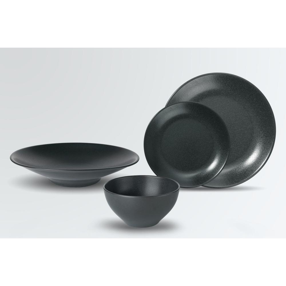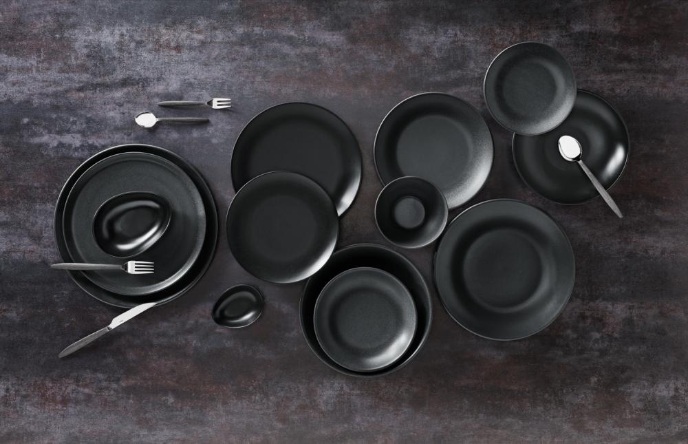 Set se sastoji od četiri ravnih tanjira Ø 18 i 24 cm, tanjira za tjestenine Ø 25,5 cm i činije ØkH 14k7 cm (0,4 l). Posuđe je u keramičkom izgledu sa mat crnom glazurom. Materijal: porcelan. Može se prati u mašini za suđe i može se koristiti u mikrotalasnoj pećnici.