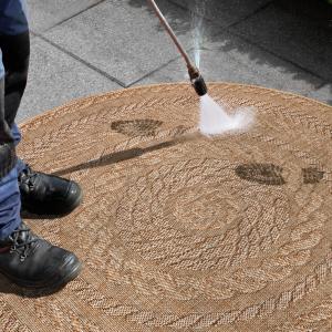 Okrugli tepih ravnog tkanja iz Northrugsa u izgledu jute. Može se koristiti u zatvorenom prostoru kao i na otvorenom. Obrađena vlakna od polipropilena su posebno izdržljiva i otporna na UV zračenje i vlagu. Pogodan i za prostorije sa podnim grijanjem.