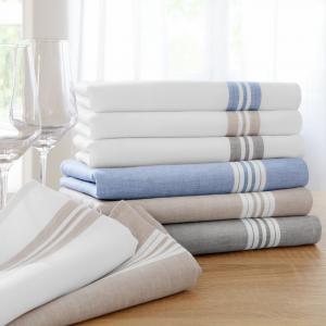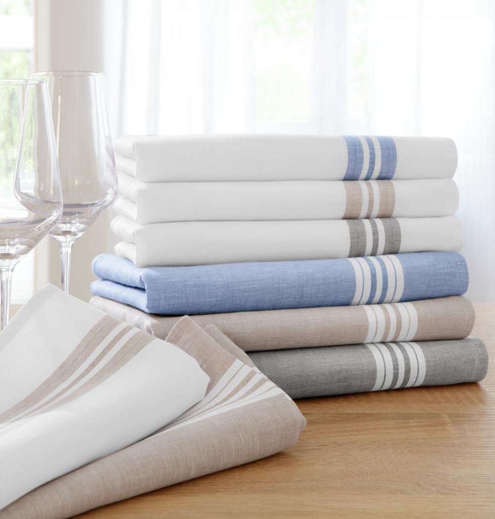 100% linen. Wash at 95°C, colorfast to chlorine. Weight approx. 200 g/m².