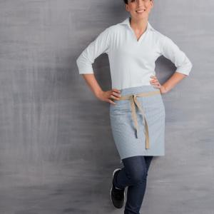 Kecelja sa finim plavo-bijelim prugama i bež trakom. Materijal: 100% pamuk.Pranje na 60°C.