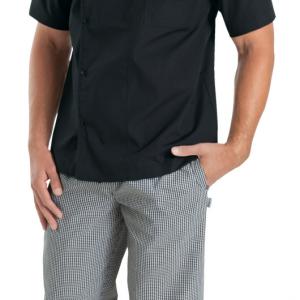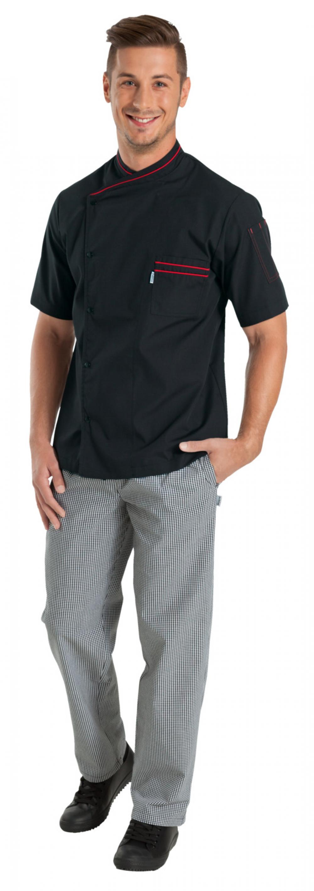 Ova muška kuvarska jakna od prijatne mešavine tkanine je posebno praktična i laka za održavanje. Sa kontrastnim cjevima, 5 kopči i otvorima za ventilaciju ispod pazuha. Sa jednim džepom na grudima i džepom za olovku na nadlaktici. Pogodno za sušenje u mašini. Dostupan u bijeloj i crnoj boji.