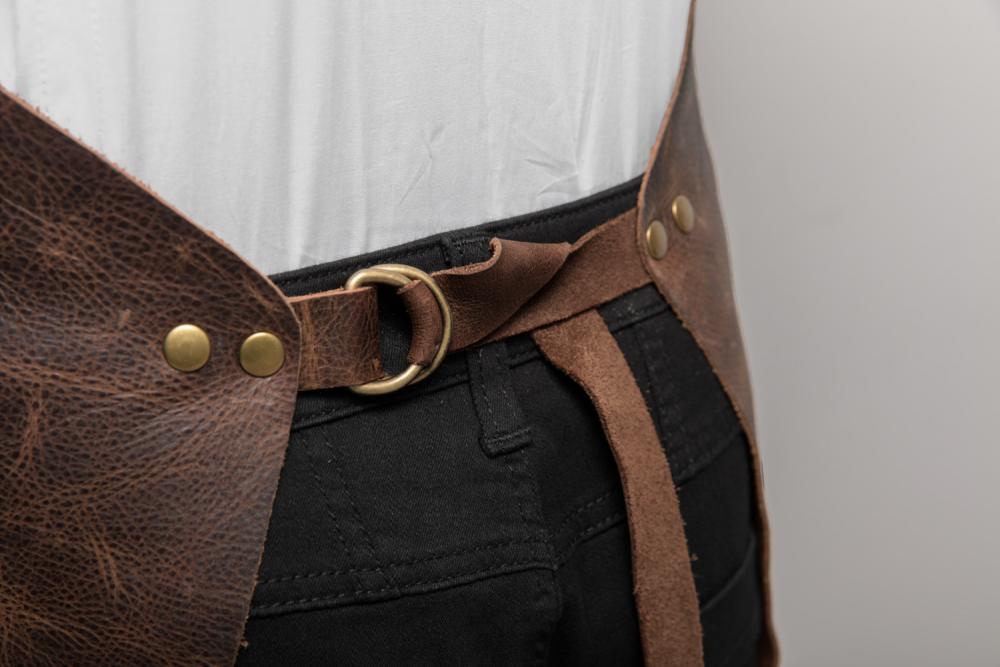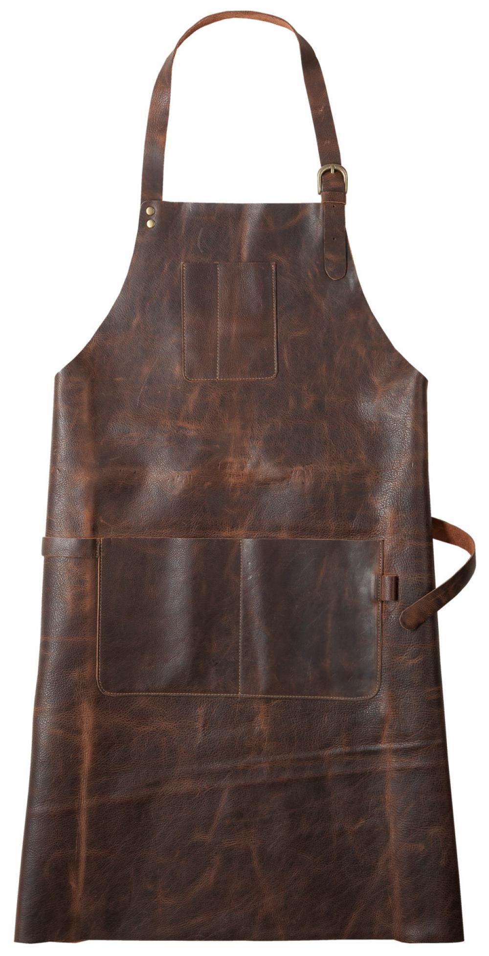 Moderna i naravno vrhunskog kvaliteta: kecelja od smeđe kože u modernom izgledu. Traka za vrat i struk su podesivi.