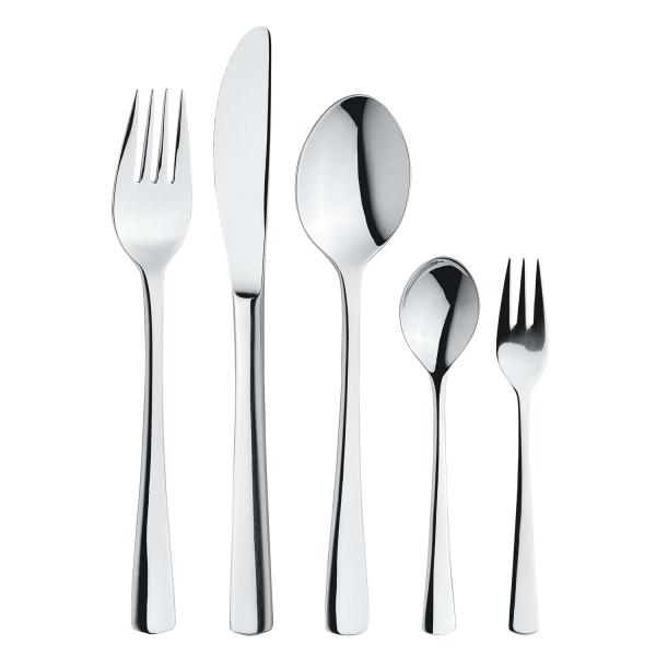 Chrome-nickel stainless steel 18/10 rustproof (table knife 13/0). The six-person set consists of six table spoons, six table forks, six table knives, six coffee spoons and six cake forks. Timeless cutlery series in a linear design. Mirror polished. Table fork: Length 19.5 cm Table knife (monoblock 13/0): Length 21.5 cm Table spoon: Length 19.3 cm Cake fork: Length 14.5 cm Coffee spoon: Length 14 cm Material thickness: 2.5 mm (measured at the thickest point of the table fork), suitable for use in the catering industry. Dishwasher safe.