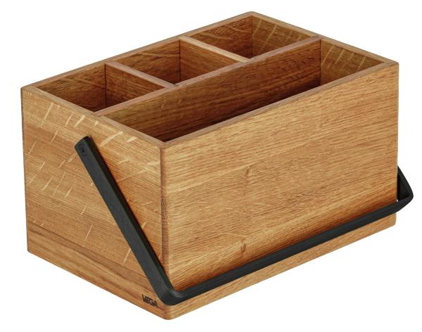 Cutlery container made of oak with folding stainless steel handle. The plastic mat on the base prevents the wood from being contaminated and can be removed for cleaning. Three small storage compartments (6x6 cm) and one large storage compartment (19.5x6 cm). Not suitable for dishwasher.