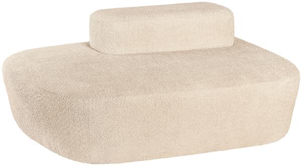 The stylish sofa impresses with its organic design and rounded shapes and is upholstered in durable bouclé fabric (100% polyester). The seat is slightly slanted to create a floating look. The irregular shape of the seat surface in relation to the backrest creates different seat depths. The backrest itself can even be used as a seat. Plastic gliders provide a 4 cm distance from the floor. For indoor use only. Delivered assembled.
