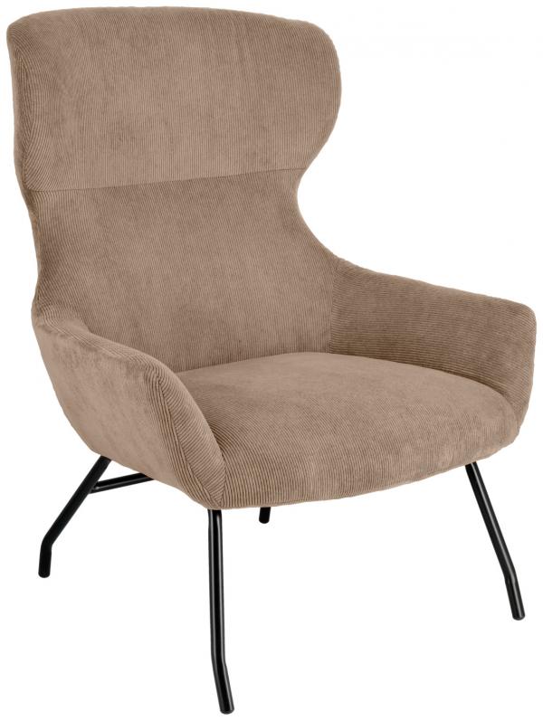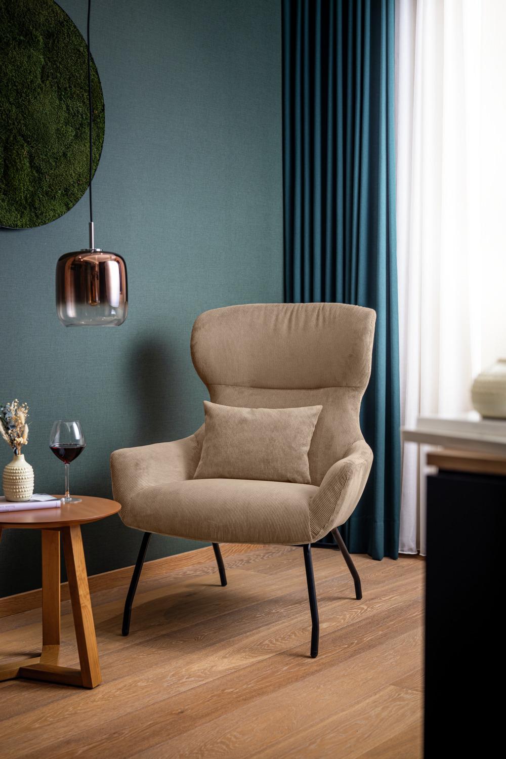 Elegant wing chair with corduroy cover (100% polyester) and powder-coated steel frame. Slightly slanted armrests for increased comfort while sitting. Plastic gliders included. Fire-resistant cover. Supplied disassembled, assembly materials included. For indoor use only.