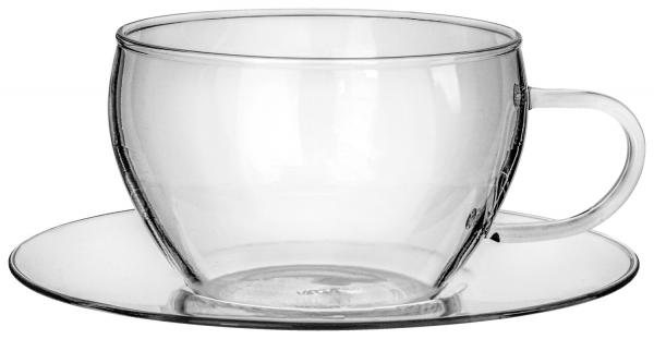 Elegant coffee glass with saucer made of high-quality, thin borosilicate glass. Suitable for hot and cold drinks. Withstand temperature fluctuations of up to 130 ° C easily. Ø saucer: 14.1 cm. Material: borosilicate glass. Dishwasher safe and microwaveable!