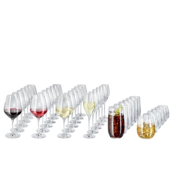 36-piece set consisting of six of each: red wine, white wine, water and champagne glasses. Dishwasher safe.