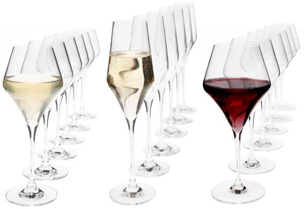 18-piece set consisting of six of each: champagne, white wine and red wine crystal glasses. Dishwasher safe.