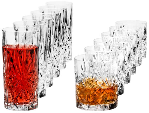 12-piece set of crystal whiskey and cocktail glasses (6 of each) with cut-glass look. Dishwasher safe.