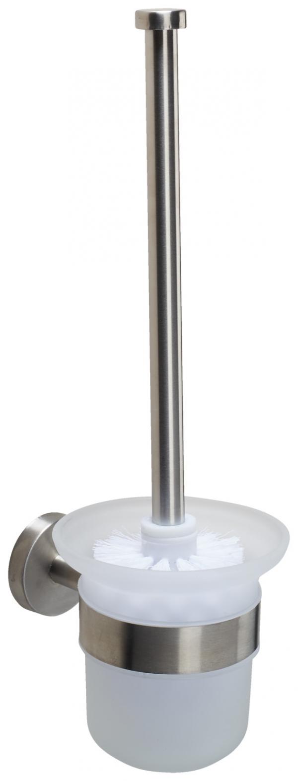High-quality WC set for hotel and restaurant WCs. Consisting of a removable satin plastic container and a stylish toilet brush. Holder and brush style in stainless steel and matt stainless steel. Glass container. Incl. fixing material for wall mounting.
