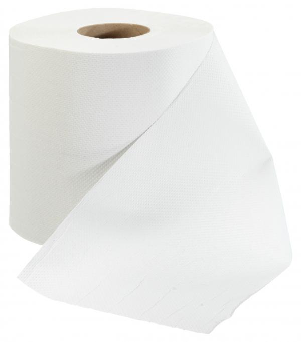 Towel roll made of 100% recycled paper, 2-ply, 450 sheets per roll, natural white. Approved for direct food contact.