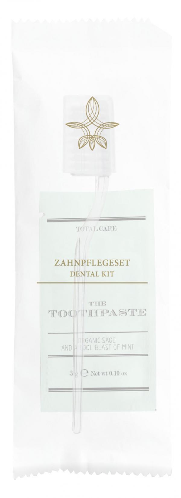 The dental kit includes a toothbrush with bristle protection and a small sachet with 3 gr. toothpaste. The sets are delivered hygienically in individual packaging.