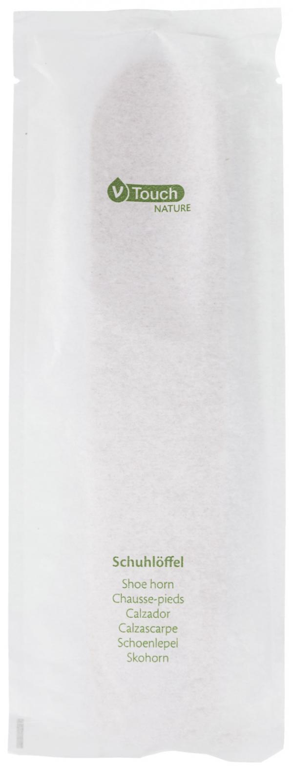 The shoehorn is part of the environmentally friendly V-Touch Nature hotel cosmetics series, which is made from renewable, plant-based raw materials (corn/straw starch). Another plus is the environmentally friendly packaging. With the environmentally friendly shoehorn, your guests can get into any shoe. The shoehorn is 19.8 cm long and is made of sturdy straw starch. * Shoehorn made of straw starch for hotel use * Individually packed in environmentally friendly paper packaging * Supplied in a pack of 100 With its timelessly simple packaging, the V-Touch Nature accessories series can be perfectly combined with all cosmetics series from VEGA. Always a good choice.