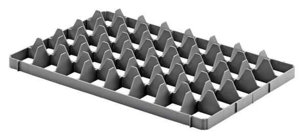 Insert for transport and wash rack system Komfort made of polyethylene. Number of compartments 40: Ideal for transporting glasses with max. Ø 6,7 cm, can be easily inserted into the box and removed. Dishwasher safe.