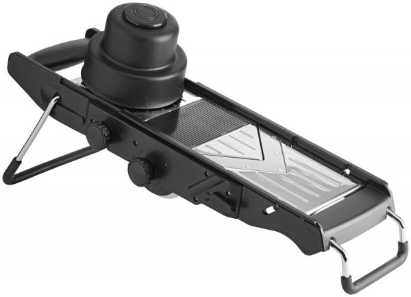 Mandolin with integrated, ultra-sharp knives made of high-quality blade steel and a movable cutting plate for faster cutting. Safe working thanks to non-slip feet and guided food holder. Multifunctional use: cutting of discs (1-8 mm), pins (8x8 mm), julienne strips (6 and 8 mm), dice (6 and 8 mm) and diamonds possible. Easy handling by clear knobs, incl. Operating instructions. Material: stainless steel and plastic (polypropylene). Food Safe! Stainless! Moistly wipeable! With rubber feet!