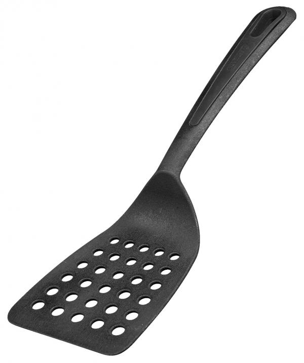 Spatula with wide, perforated surface and flat edge. Ideal for pots and pans with non-stick coatings. Angled handle makes it suitable for high-sided pans. Heat-resistant up to 210°C. Suitable for dishwashers.