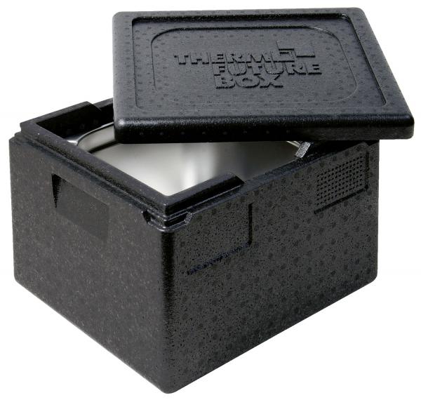 Robust and durable thermo box with fixed lid (without content) made of black EPP plastic (material thickness: 3 cm). Suitable for transporting, insulating, cooling and keeping food warm. The insulating properties are between -40 °C to +120 °C, maximum temperature loss in a closed box 2-3 °C per hour. Particularly unbreakable, hygienic, food safe and lightweight. Environmentally friendly, 100% recyclable and CFC-free. Easily stackable with and without lid. Select depth GN containers according to the inner height.