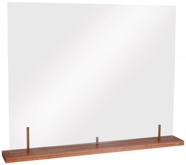 The Bartea hygiene barrier is perfectly suited for the hygienic separation between the tables so that the risk of infection is reduced. It consists of an 80x10x2 cm base plate made of solid beech wood oiled in walnut color. The transparent plate 75x60cm is made of high-quality 3mm perspex. A simple and tool-free plug-in system with wooden pins holds the pane securely in the wooden construction. As care product we recommend our disinfectant 30089619.