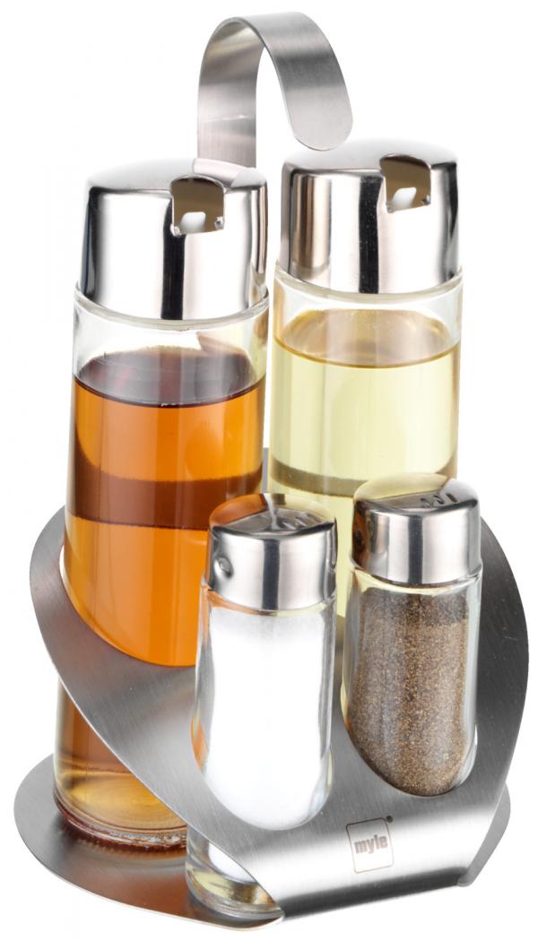 Modern cruet for vinegar/oil and salt/pepper made of chrome stainless steel 18/0, rustproof. The larger jars have 170 ml capacity each, the smaller ones 40 ml each. Dishwasher safe.