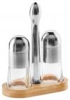 3-piece salt and pepper cruet stand set made of of brushed chrome steel 18/0 in combination with plastic. Dishwasher safe!
