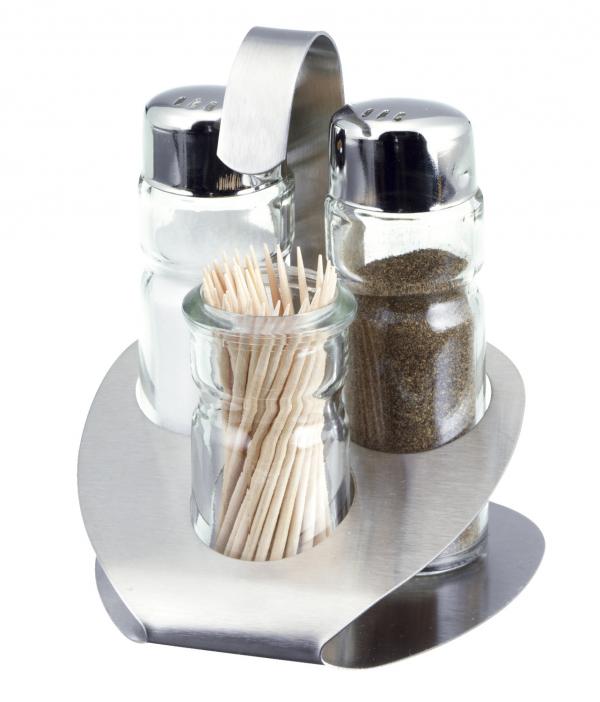 Classic cruet with salt and pepper shaker and jar for toothpicks. Frame and lid made of chrome stainless steel 18/0, rustproof. Dishwasher safe.